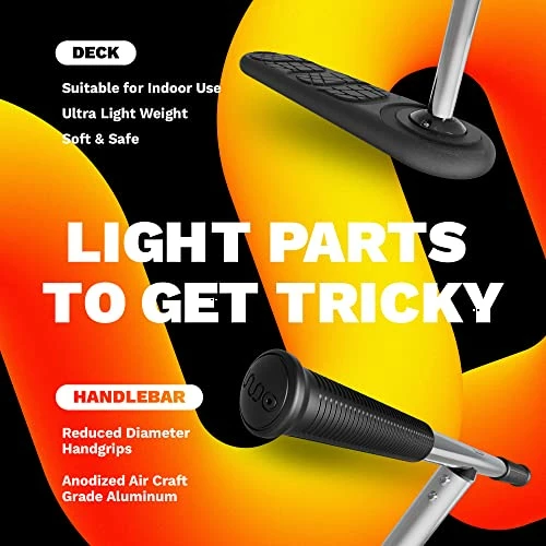 - ?Use it at home or on a trampoline: This trick scooter is easy to build and use. Its strong, secure and lightweight design allows your kids to practice all kinds of stunts, it is safer on a trampoline than normal scooters.