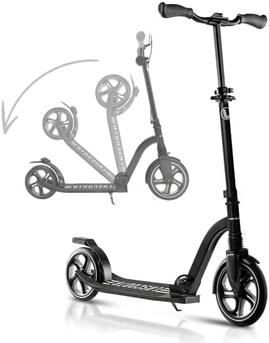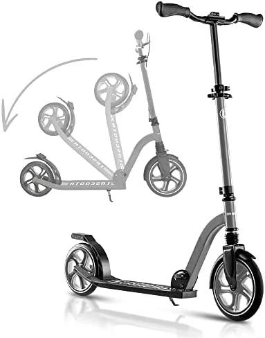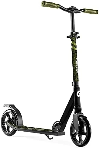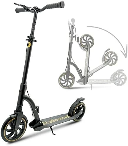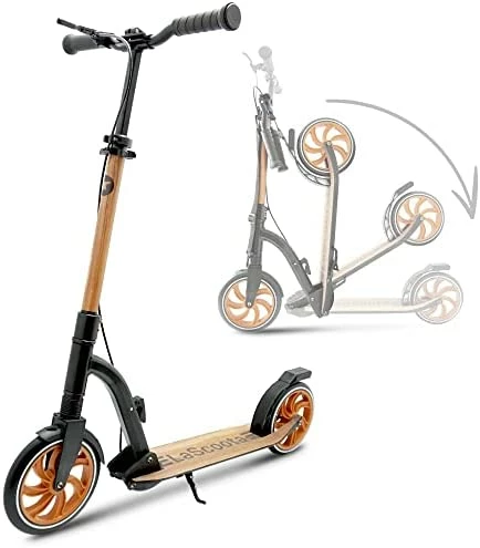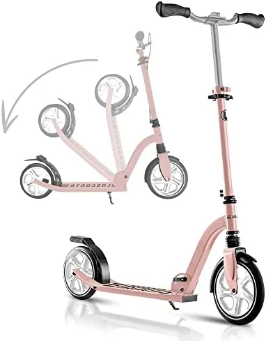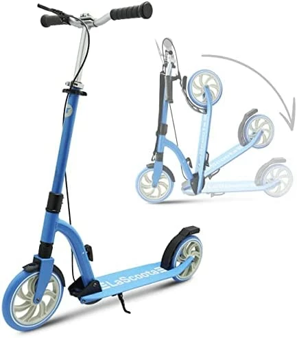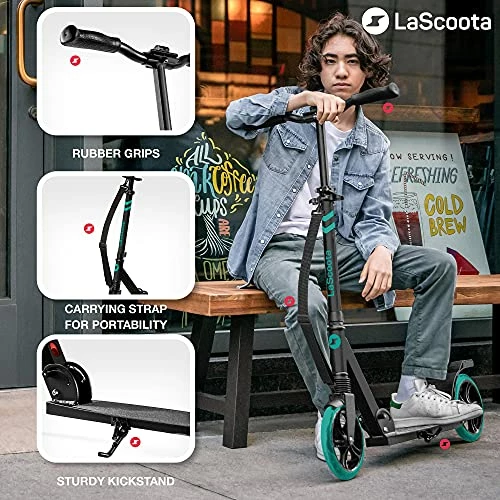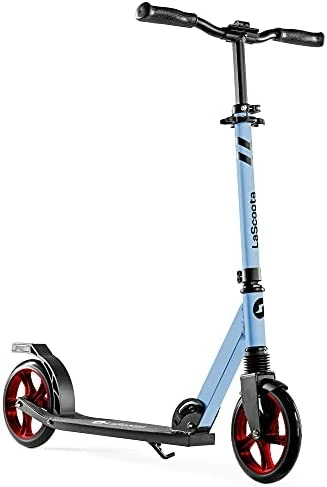 We bought several scooters at the same time. Some from LaScoota, some from another mfr. Overall, the LaScoota cost more, but it was perfect for me (5’10” adult 230lbs). We scooted ~8 miles the day we used them, chasing a family member around Chicago, during the marathon. We traveled on the subway (el) and also scooted from place to place. This unit is a few pounds heavier than the next competitor, but it wasn’t heavy. Everyone who rode both, agreed the Lascoota was the most sturdy. It folds up easy enough. It’s easy to carry. The larger wheels on this unit were perfect for rough, uneven pavement. You need the larger wheels, because small wheels will get caught in the cracks. I felt fine using this. The handlebars on this, extend a couple inches higher than the competitor. My 6′ son used one, and appreciated the taller height on the bars, also. It’s a bit bigger than the next closest competitor, and a bit more, but worth it if you want the feeling of solid, sturdy, tall. CONS: The product description changes, when you put it into a cart. Ours changed from Charcoal to Pink. Amazon Cust Svc looked at it, and themselves were confused. We didn’t know what I was going to get, when it arrived. Thankfully, we got charcoal, matching the original product selection (not the cart). Lascoota has a website contact page, it’s was no help to me. They took days to respond, “if” they responded, and their eventual response didn’t help. If you have questions, contact the Lascoota store here on Amazon. They’re much more responsive, and helpful in their answers. Overall, glad we purchased.