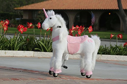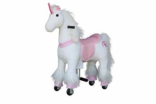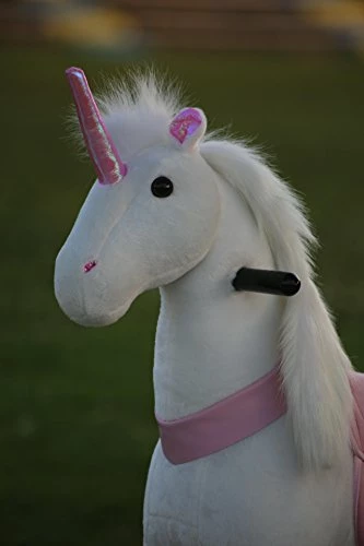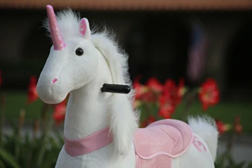 We got this for our daughter for Christmas and she LOVED it! There is no batteries necessary and no charging required. There are foot pedals you push down on that makes it do the βgiddy-upβ motion. The one thing I will say is you canβt go backwards so you need adequate space to turn around instead. There are little loops that catch the wheels when the pedals get pushed down and that catapults the unicorn forward. We actually tied up the loops so she could move it backwards BUT it didnβt move at all when we did that. So we are stuck with no backward motion. But itβs a very sturdy toy, she fits it perfect and is even taller for her age. She is 4 1/2. Also, the fur is so soft, she loves just sitting on it and hugging it. Very happy with the product for the price.
