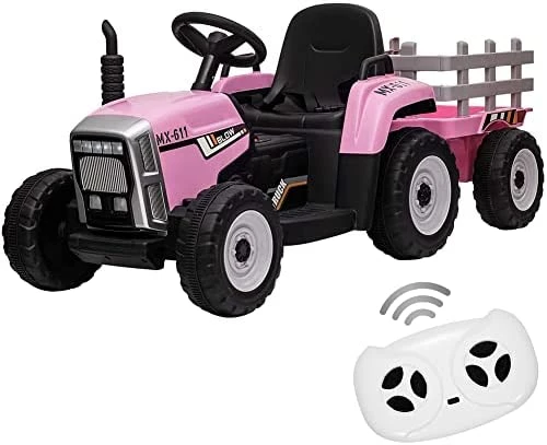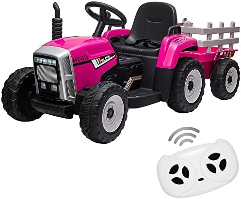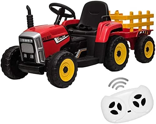 - 🚜Realistic Tractor Design–Bright 7-LED headlights,control padel,realistic 2+1 gear shift, solid armrest,detatchable trailer, rechargable battery with 2*12V motor.Overall Dimensions:54″(L) x 20″(W) x 21″(H); Weight Capacity: 66 lbs. Net Weight: 28 lbs. Recharge time: 8-12 hours.