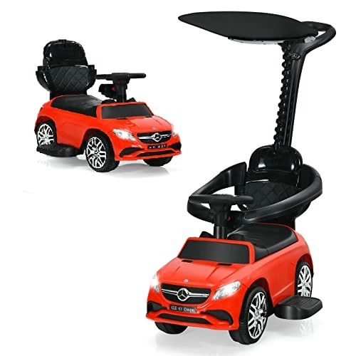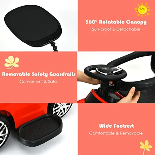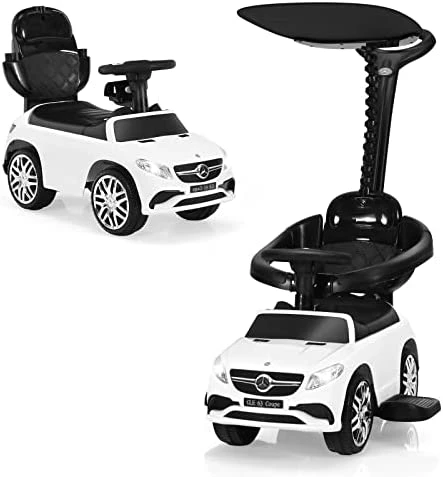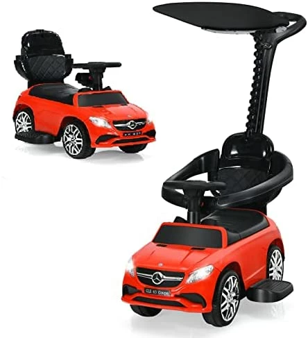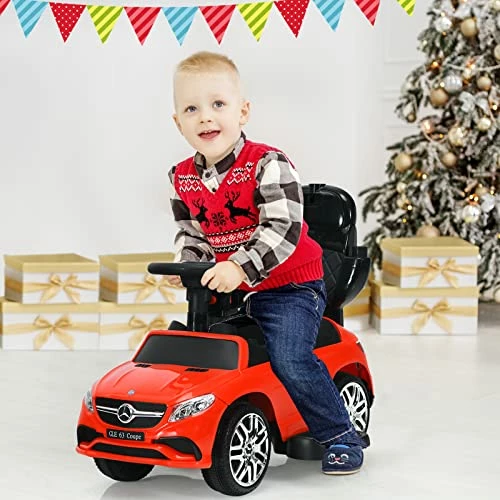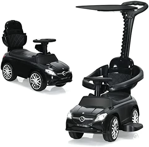 - πFun with Realistic Driving Experience: This sliding car has a realistic Mercedes Benz Car design, which features with a rotatable steering wheel, a music and horn push button.