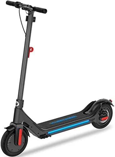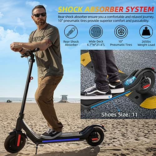 - Commute With Comfort – 10″ Shock Absorbing Pneumatic Tires, it is explosion-proof, anti-puncture and self-healing. Rear Shock Suspension brings up fantastic comfortable riding experience. 6.7″W*21.6″L deck with large soft anti-slip pedal makes both of your feet comfort to step on. The cruise control can free your right hand during a long distance of commuting.